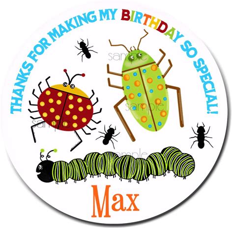 Personalized Insect Birthday Favor Stickers, Printed Custom Bug Themed Birthday Treat Bag Labels, Set Of 10 Colorful Labels